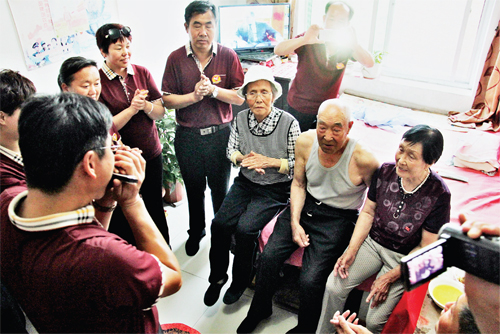 7月2日,原平市新原鄉(xiāng)集中供養(yǎng)敬老院里歌聲飛揚,原平佳藝藝術(shù)團(tuán)和口琴聯(lián)盟會給這里的老人們送上了一道文化大餐。原平市加強養(yǎng)老服務(wù),在各鄉(xiāng)鎮(zhèn)建設(shè)養(yǎng)老院,使老年人老有所依、老有所養(yǎng),社會團(tuán)體和群眾藝術(shù)團(tuán)經(jīng)常送文化、送藝術(shù)到養(yǎng)老院,豐富了老人們的文化生活。圖為志愿者為老人獻(xiàn)唱。(吉建平 攝)