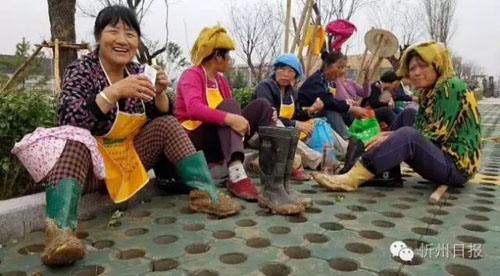 《綠化娘子軍的早餐》,在忻州一中北校區(qū),戰(zhàn)斗了一個早晨,搶時間、搶速度進行植樹的康培綠化公司的娘子軍在吃早飯,補充體力。(黃濤 攝)