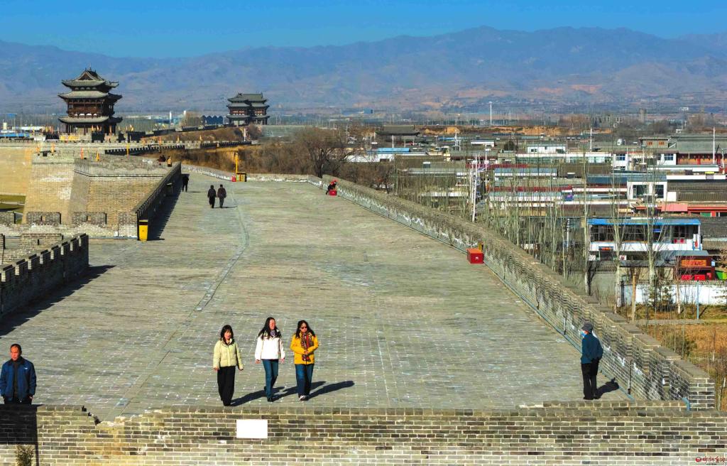 代州古城西城墻歷經(jīng)多年保護性修繕,是古城目前唯一修復(fù)完整并對外開放的城墻段落。圖為12月1日,游人登上西城墻游覽觀光。(