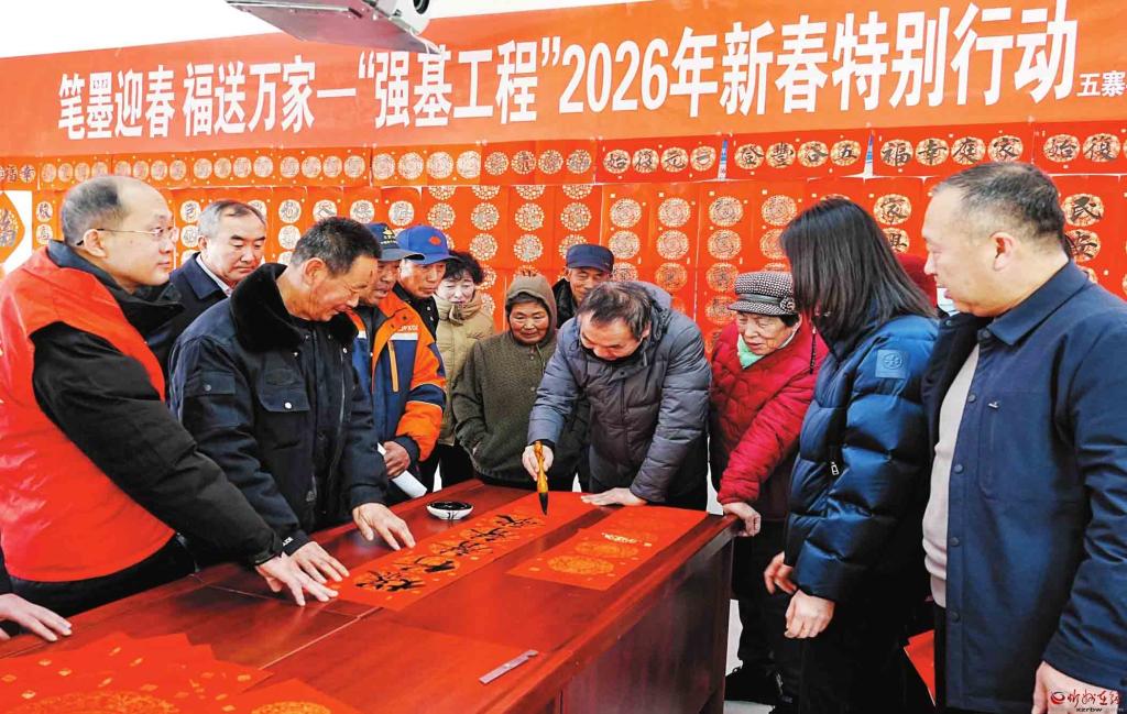 新春將至,年味漸濃。近日,由五寨縣文聯(lián)聯(lián)合縣總工會、團(tuán)縣委舉辦的“筆墨迎春福送萬家”送春聯(lián)活動走進(jìn)李家坪鄉(xiāng)李家坪、張家坪村,以筆墨為媒傳遞新春祝福,用文化服務(wù)筑牢基層精神根基,讓“強(qiáng)基工程”的溫暖觸角延伸至鄉(xiāng)村一線。(劉篤效攝)