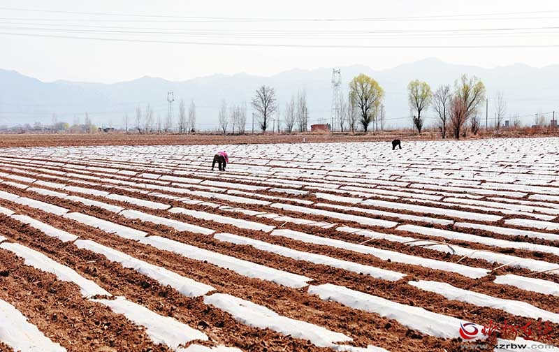 4月9日,定襄縣留念村村民搶抓農(nóng)時,栽種西瓜苗、搭建瓜架,田間一派繁忙的春耕景象。(