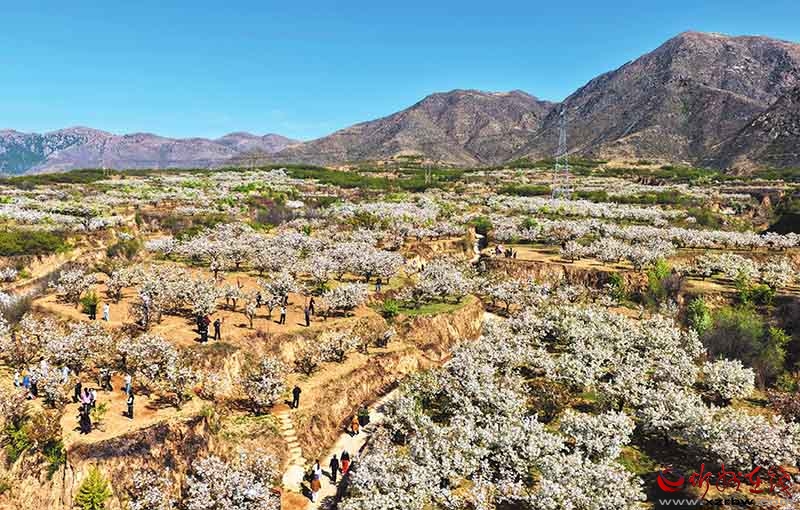 4月18日,原平市上莊村梨花盛放,千樹萬樹如雪似海,游人踏青賞花、拍照打卡,盡享春日時光。(