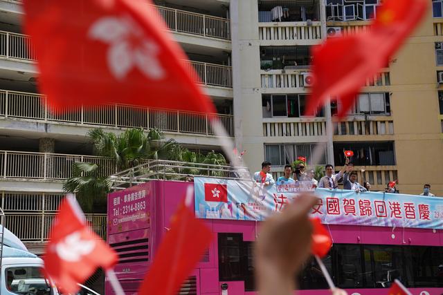 7月1日,市民揮舞國旗、區(qū)旗和巡游巴士互動(dòng)。新華社記者王申 攝