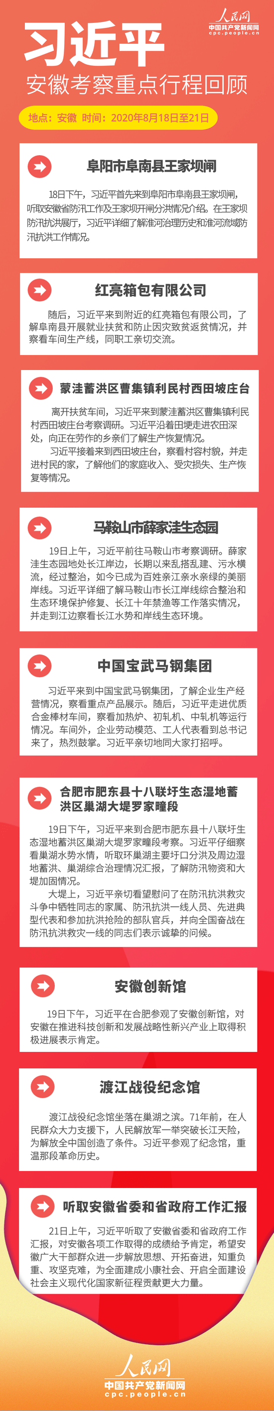 8月18日至21日,習近平來到安徽,看望慰問受災群眾和防汛救災一線人員,就統(tǒng)籌推進常態(tài)化疫情防控和經(jīng)濟社會發(fā)展工作、加強防汛救災和災后恢復重建、推進長三角一體化發(fā)展、謀劃“十四五”時期經(jīng)濟社會發(fā)展進行調研。