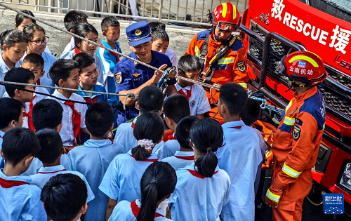 5月9日,在云南省普洱市景谷縣森林消防中隊,消防員向?qū)W生講解滑輪在救援中的運用。(新華社發(fā) 郭元首 攝)