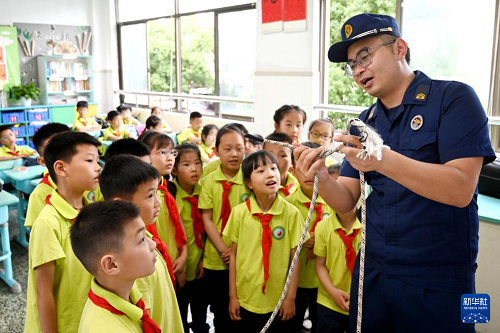 5月9日,浙江省武義縣消防大隊救援人員為武義縣實驗小學(xué)學(xué)生講解逃生繩的使用方法。(新華社發(fā) 張建成 攝)