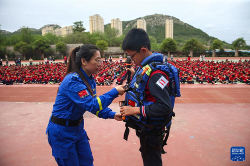 5月9日,在山東省濟南市泉海小學(xué),藍天救援隊志愿者給學(xué)生講解、演示救援服穿法。(新華社發(fā) 郝鑫城 攝)