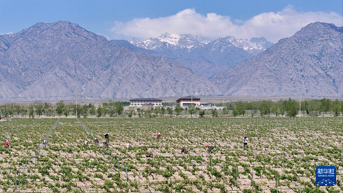在位于寧夏銀川市賀蘭山東麓的海悅?cè)屎途魄f,工人在為葡萄藤抹芽、剪枝(5月9日攝)。(新華社記者 王鵬 攝)