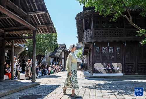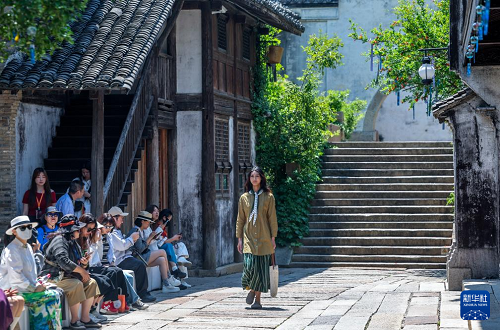 5月12日拍攝的濮院時尚古鎮(zhèn)老街上舉行的時裝周“自然剪輯時裝秀”。(新華社記者 徐昱 攝)