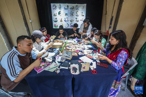 5月12日,在濮院時尚古鎮(zhèn)的一家拼布工作坊內(nèi),外國游客在體驗布藝創(chuàng)意拼貼。(新華社記者 徐昱 攝)