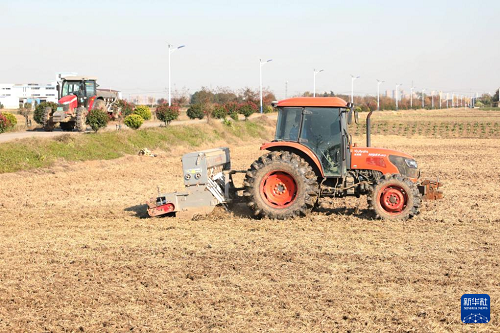 11月19日,在江蘇省常州市金壇區(qū)金城鎮(zhèn),農(nóng)機(jī)在田里播種小麥。(新華社發(fā) 陳暐 攝)