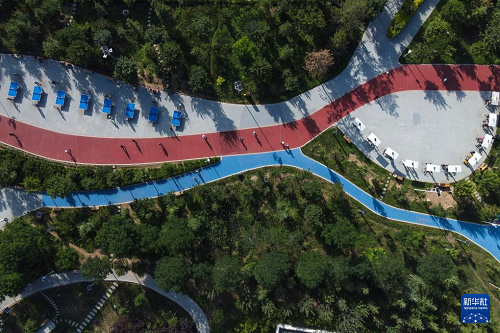 2025年7月7日,市民在平?jīng)鍪嗅轻紖^(qū)中心城區(qū)的平?jīng)龀鞘谢盍珗@休閑健身(無人機(jī)照片)。(新華社發(fā) 吳希會(huì) 攝)