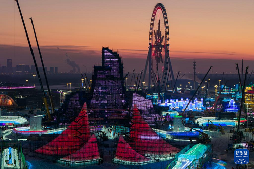 這是12月10日拍攝的哈爾濱冰雪大世界主塔施工現(xiàn)場(chǎng)(無(wú)人機(jī)照片)。(新華社記者 張濤 攝)