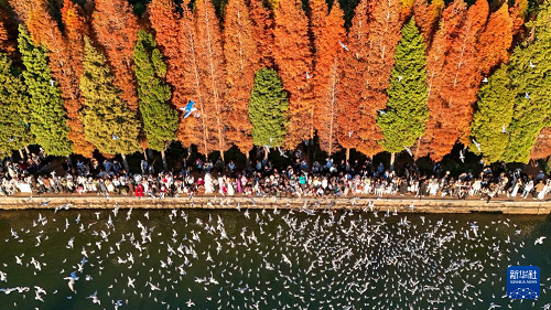 12月10日,游客在滇池畔的海洪濕地公園喂紅嘴鷗(無人機照片)。(新華社記者 彭奕凱 攝)