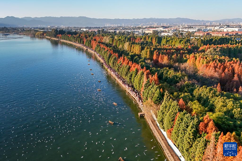 12月10日在滇池畔拍攝的海洪濕地公園一景(無人機照片)。(新華社記者 彭奕凱 攝)