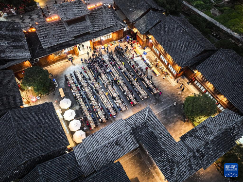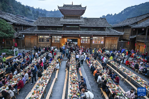 在貴州省黎平縣肇興侗寨,侗族同胞與來賓在侗年活動(dòng)中共享長(zhǎng)桌宴(12月20日攝)。(新華社記者 楊文斌 攝)