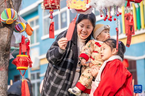 12月30日,在河南省駐馬店市西平縣一所幼兒園的元旦親子游園廟會(huì)上,小朋友和家人一同參與猜燈謎游戲。(新華社發(fā) 趙永濤 攝)