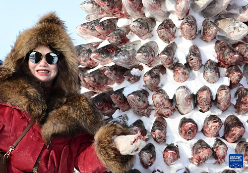 1月10日,在黑龍江省肇東市大似海冬捕漁獵文化節(jié)上, 游客在“凍魚(yú)塔”前留影。(新華社發(fā) 楊威 攝)