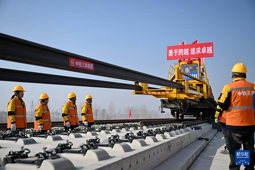 2月1日上午,在河北省保定市順平縣的雄忻高鐵建設(shè)現(xiàn)場,中鐵三局集團(tuán)施工人員將首對500米長鋼軌平穩(wěn)、精準(zhǔn)地鋪設(shè)在無砟道床上,標(biāo)志著雄忻高鐵正式進(jìn)入鋪軌施工階段。