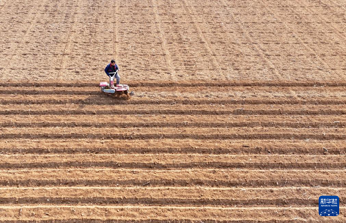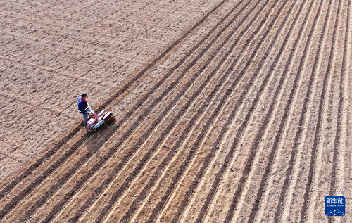 2月13日,在山東省棗莊市山亭區(qū)桑村鎮(zhèn),農(nóng)民駕駛農(nóng)機開溝準(zhǔn)備播種馬鈴薯(無人機照片)。(新華社發(fā) 李宗憲 攝)