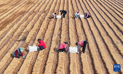 2月13日,在山東省棗莊市山亭區(qū)桑村鎮(zhèn),農(nóng)民在播種馬鈴薯(無人機照片)。(新華社發(fā) 李宗憲 攝)