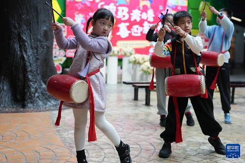 2月25日,小朋友在杭州青少年活動中心參加腰鼓隊巡游表演。(新華社記者 黃宗治 攝)