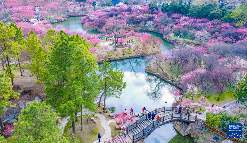 2月25日,游客在江蘇南京明孝陵梅花山上賞梅踏春(無人機照片)。(新華社發(fā) 楊素平 攝)
