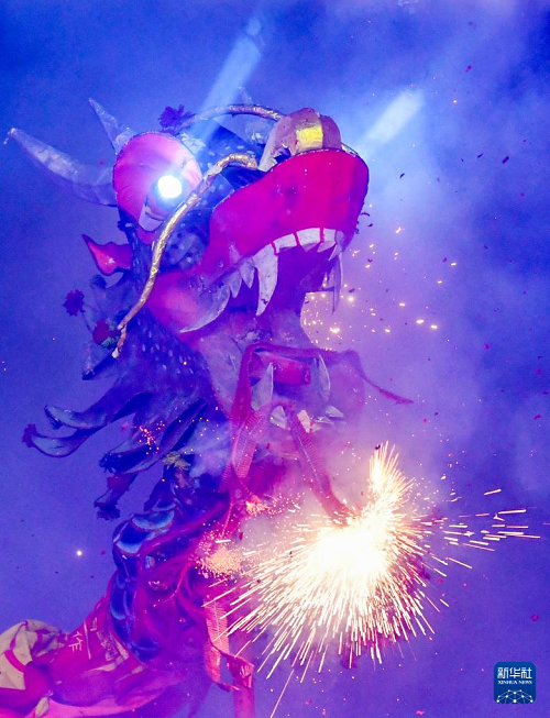 2月27日,在廣西賓陽(yáng)縣炮龍文化廣場(chǎng),人們?cè)谂邶埞?jié)上舞炮龍。(新華社記者 陸波岸 攝)