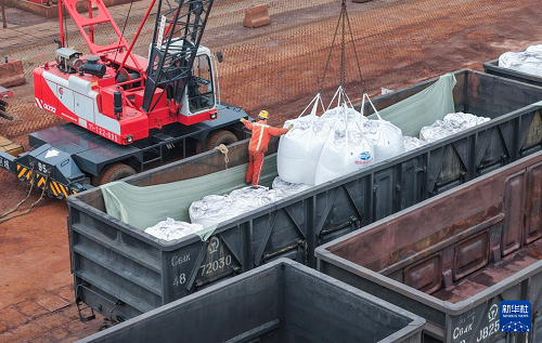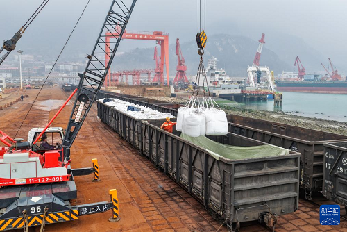 3月4日,工人在江蘇連云港港東方港務(wù)分公司碼頭鐵路裝車點(diǎn)將化肥裝上貨運(yùn)專列(無人機(jī)照片)。(新華社發(fā) 王健民 攝)