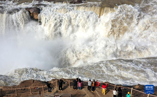 3月5日,游客在黃河壺口瀑布景區(qū)游覽(無人機(jī)照片)。(新華社發(fā) 呂桂明 攝)