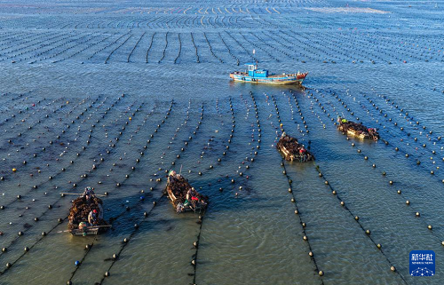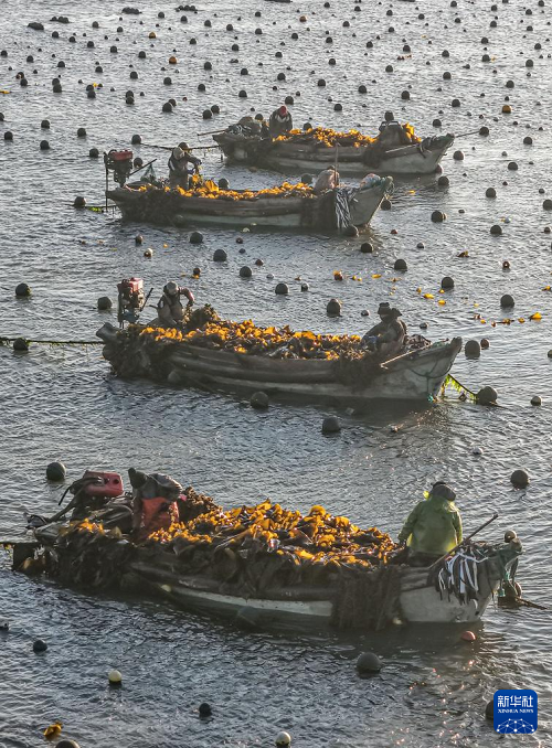 眼下,在我國海帶主產(chǎn)區(qū)山東省榮成市,海洋牧場(chǎng)海帶養(yǎng)殖區(qū)一派繁忙景象。養(yǎng)殖戶對(duì)近岸養(yǎng)殖區(qū)達(dá)到成熟標(biāo)準(zhǔn)的海帶分批收割,為后期收割的海帶留出生長(zhǎng)空間,以便提高海帶產(chǎn)量和質(zhì)量。