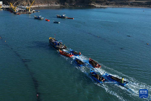3月9日,在山東省榮成市愛倫灣海洋牧場(chǎng),滿載海帶的養(yǎng)殖船駛往碼頭(無人機(jī)照片)。(新華社發(fā) 王福東 攝)