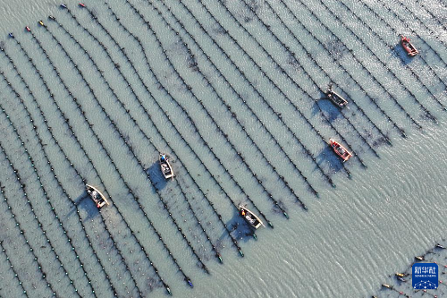 3月9日,在山東省榮成市愛倫灣海洋牧場(chǎng)海帶養(yǎng)殖區(qū),養(yǎng)殖工人收獲海帶(無人機(jī)照片)。(新華社發(fā) 王福東 攝)