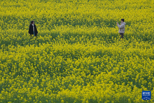3月11日,游客在桐廬縣梅蓉村油菜花田間拍照。(新華社記者 黃宗治 攝)