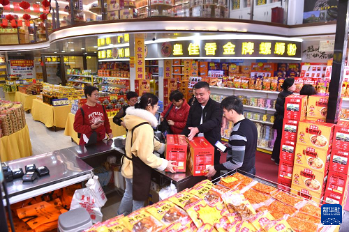 在廣西柳州市青云民生市場(chǎng)一家特產(chǎn)超市,游客在選購螺螄粉(2026年3月10日攝)。(新華社記者 黃孝邦 攝)