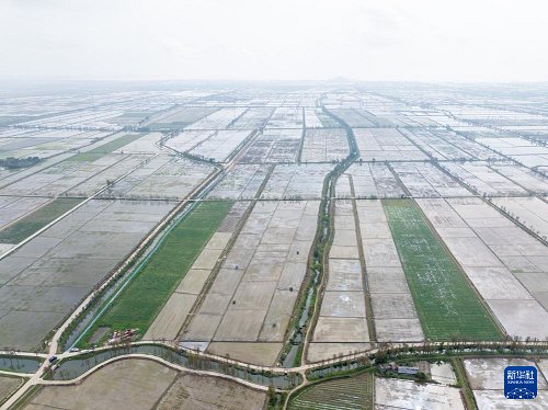 3月24日,在廣東江門臺山市都斛鎮(zhèn),農(nóng)業(yè)無人機(jī)在插好秧苗的田間作業(yè)(無人機(jī)照片)。(新華社記者 毛思倩 攝)