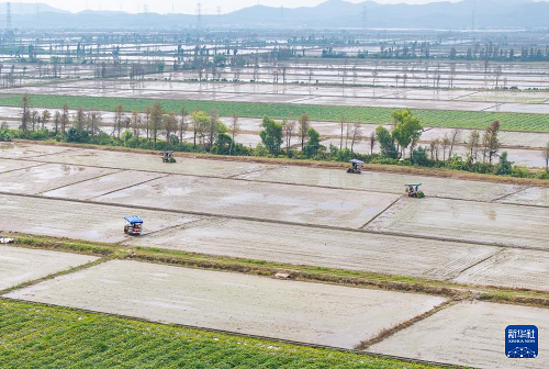 3月24日,在廣東江門臺山市都斛鎮(zhèn),工作人員操作插秧機(jī)在田間插秧(無人機(jī)照片)。(新華社記者 毛思倩 攝)
