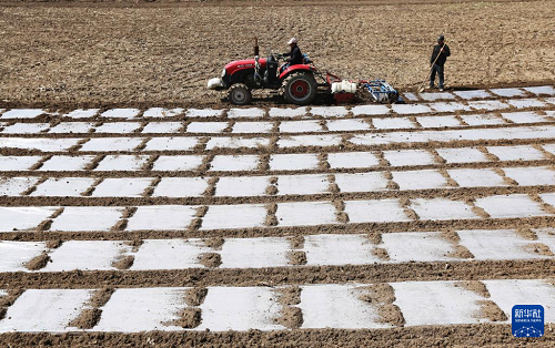 4月1日,農(nóng)機手駕駛農(nóng)機在甘肅省天水市武山縣馬力鎮(zhèn)的田間覆地膜春耕。(新華社發(fā) 王克賢 攝)