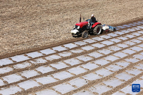 4月1日,農(nóng)機手駕駛農(nóng)機在甘肅省天水市武山縣馬力鎮(zhèn)的田間覆地膜。(新華社發(fā) 王克賢 攝)