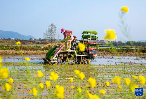 4月1日,江西省九江市都昌縣蔡嶺鎮(zhèn)楊灣村,農(nóng)民駕駛農(nóng)機在田間機插早稻。(新華社發(fā) 傅建斌 攝)