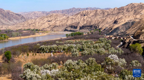春日的寧夏中衛(wèi)市南長灘村,黃河水蜿蜒流淌,岸邊綠芽初綻,村里梨花競相開放,勾勒出一幅生機(jī)盎然的黃河春景圖。