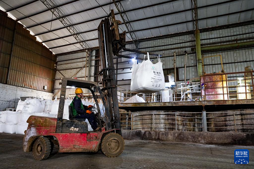 4月13日,在金昌神泥科技有限公司原料倉(cāng),工作人員進(jìn)行廢渣投料作業(yè)。(新華社記者 郎兵兵 攝)
