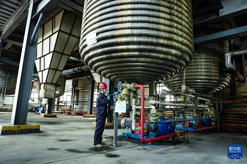 4月13日,在金昌高能環(huán)境技術(shù)有限公司濕法車間,工作人員進(jìn)行浸出作業(yè)。(新華社記者 郎兵兵 攝)