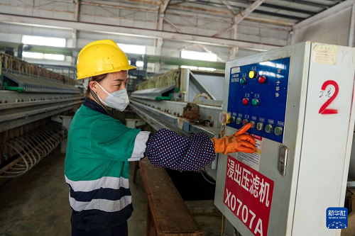 4月13日,在金昌神泥科技有限公司浸出車間,工作人員操作壓濾機(jī)進(jìn)行壓濾作業(yè)。(新華社記者 郎兵兵 攝)