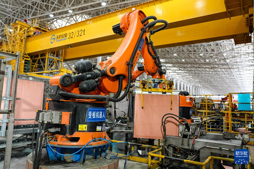 4月14日,在金川集團(tuán)永昌銅業(yè)有限公司精煉分廠,受板機(jī)器人在進(jìn)行剝片作業(yè)。(新華社記者 郎兵兵 攝)