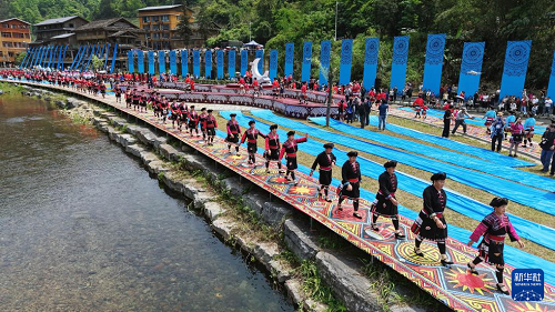4月19日,在廣西桂林市龍勝各族自治縣龍脊鎮(zhèn)金江村黃洛瑤寨,當?shù)厝罕妳⒓印癟臺秀”(無人機照片)。(新華社發(fā) 韋吉陽 攝)