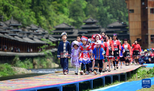 4月19日,在廣西桂林市龍勝各族自治縣龍脊鎮(zhèn)金江村黃洛瑤寨,小朋友身著民族服裝參加“T臺秀”。(新華社發(fā) 潘志祥 攝)