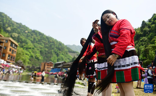 4月19日,在廣西桂林市龍勝各族自治縣龍脊鎮(zhèn)金江村黃洛瑤寨,瑤族婦女在河邊展示長發(fā)梳妝。(新華社發(fā) 韋吉陽 攝)