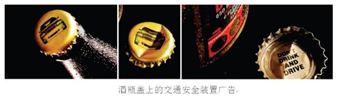 美國將警示語作為酒品包裝的強(qiáng)制性標(biāo)注內(nèi)容,要求飲料,酒的品牌標(biāo)簽、獨(dú)立的前標(biāo)簽或者背標(biāo)簽、側(cè)標(biāo)簽都應(yīng)獨(dú)立,并有別于標(biāo)簽中其他信息地標(biāo)示:“政府警示,根據(jù)普通外科醫(yī)生建議,孕婦不應(yīng)該飲酒,以防止新生兒缺陷,飲酒會(huì)減弱個(gè)人駕駛車或操控機(jī)械的能力并可能引發(fā)健康問題。”此外,國外的產(chǎn)品包裝設(shè)計(jì)上也植入了公益理念。如上圖廣告可對飲酒人群針對性的進(jìn)行廣告宣傳,采用打開酒瓶蓋必須以破壞“車輛”為代價(jià)的形式,傳達(dá)喝酒不能開車的安全理念。