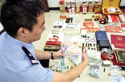 昨日,南岸公安分局,警方正在清點(diǎn)29歲“金領(lǐng)男”田某行竊的奢侈品。 本報(bào)記者 李斌 攝